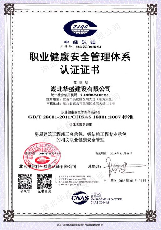 职业健康安全管理体系认证证书